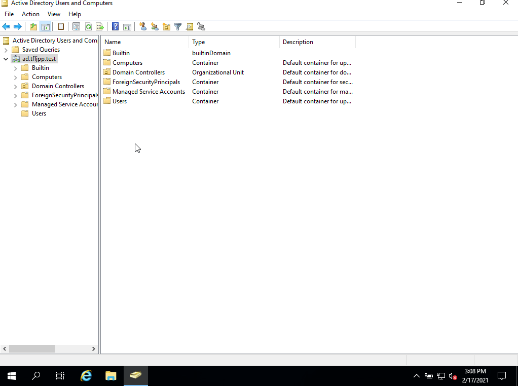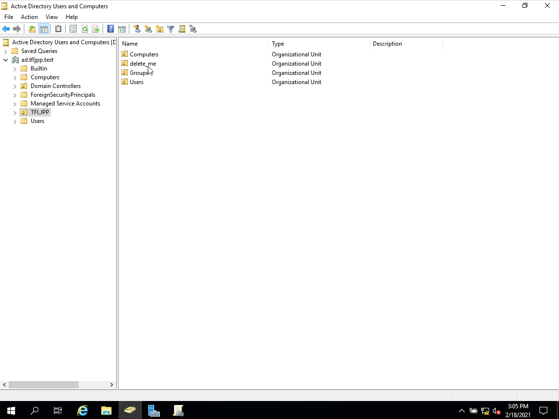 Let’s start with creating our first OU. I recommend, that for any AD environment you create, you start with 1 OU that houses all the objects you are going to create. I usually use a abbreviation of the company name, most likely the same one I used for the NetBIOS domain name (TFLJPP\username).