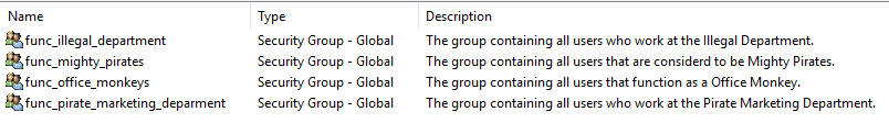 | func_name | A global group that contains users who work at a specific function or a specific users who have a job that requires access to both previously defined functions | func_marketing, func_legal, func_markting_and_legal |