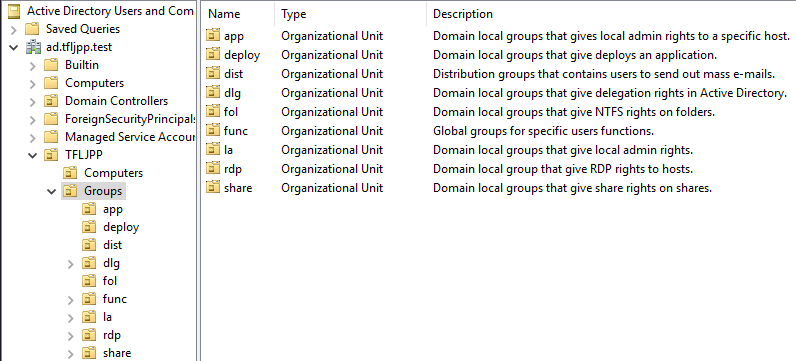 I also create separate OU’s for each group prefix and ensure that the description explains their function.