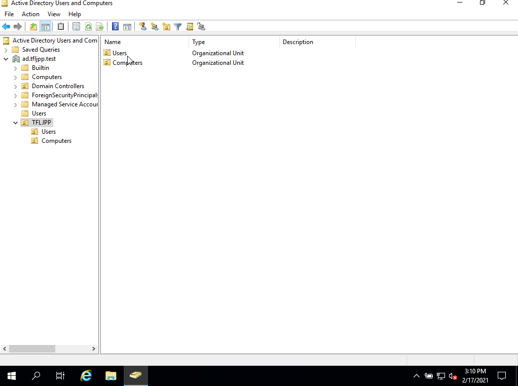 So since we work for Mr.Threepwood the first account we are going to create is his. To create a new user in AD open ADUC, go to the right OU (in our case TFLJPP -> Users) and right click on in the main window.