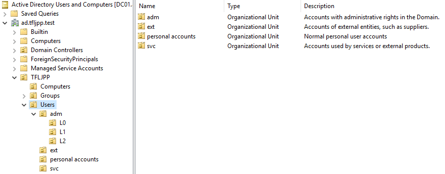 I also create separate OU’s for each user prefix and ensure that the description explains their function (not their password).